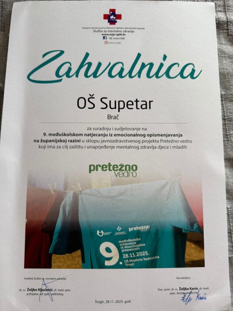 U organizaciji Nastavnog zavoda za javno zdravstvo Splitsko-dalmatinske županije, učenici 6.a i 6.b razreda su po četvrti put prisustvovali školskom, a potom i međuškolskom natjecanju iz emocionalne pismenosti održanom 28. studenog 2025. u Osnovnoj školi Majstora Radovana Trogir. Ovaj projekt temelji se na zaštiti mentalnog zdravlja djece i mladih te na poticanju važnosti rada na emocionalnoj pismenosti i kompetentnosti.